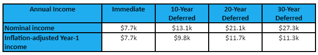 • For a 10-year deferment, the annuity still comes out ahead, $9.8k vs. $7.3k – a healthy 34% edge.