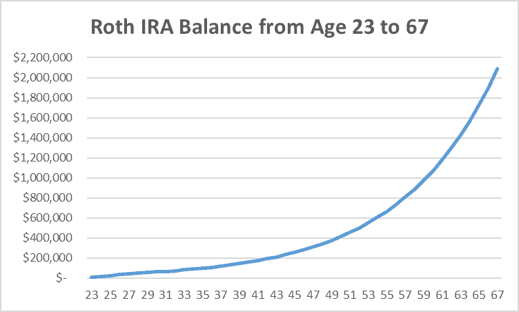 The following table shows how her Roth IRA balance grows over time until she turns 67, by which time the IRA is worth nearly $2.1 million.